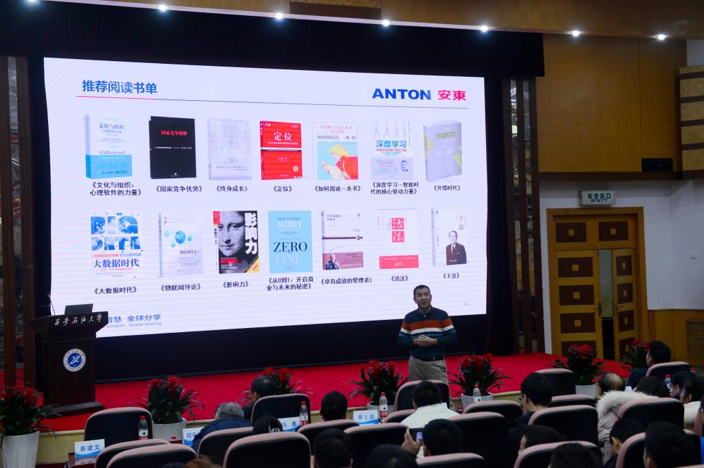 捐贈儀式后,羅林以《新時代,新物種,走在時代前列—創(chuàng)造偉大的公司,培養(yǎng)偉大的人才》為題為同學(xué)們作了一場精彩報告。他從安東集團(tuán)的經(jīng)營理念創(chuàng)新、產(chǎn)業(yè)布局創(chuàng)新、商務(wù)模式創(chuàng)新、技術(shù)改革創(chuàng)新、人才賦能創(chuàng)新、企業(yè)文化沉淀等六個方面介紹了安東石油服務(wù)集團(tuán)的創(chuàng)新發(fā)展歷程,分享了艱苦創(chuàng)業(yè)如何不斷突破新的邊界、不斷走出舒適區(qū)和人才快速成長的基本原理等內(nèi)容。