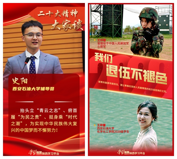 學校主動作為,選派專人擔任“學習強國”陜西學習平臺管理員和通訊員,嚴格按照平臺供稿規(guī)范要求積極供稿,確保供稿稿件導向正確、主題契合。踴躍參與“學習強國”陜西學習平臺主辦的“二十大精神大家談”“我們退伍不褪色”等主題征集活動,在更廣領(lǐng)域、更寬范圍講好西石大故事。三年來,“學習強國”陜西學習平臺共采用我校相關(guān)稿件100余篇,宣傳部武威獲評2022年度優(yōu)秀管理員(通訊員)。學校依托“學習強國”平臺強大資源優(yōu)勢,持續(xù)做好理論宣講和思想政治教育工作,不斷調(diào)動廣大師生在“學習強國”平臺學習的參與度和積極性。經(jīng)濟管理學院李春霄獲評2021年度優(yōu)秀學員,科技處杜永峰2023年受聘基層義務宣傳員。2023年9月,學校開通“學習強國”同學匯,積極發(fā)布報道校園動態(tài),多次登上全國高校熱度榜,持續(xù)引導廣大學生學好用好同學匯。機械工程學院工業(yè)設計系師生設計的“學習強國”聯(lián)合文創(chuàng)產(chǎn)品,上架強國商城,成為周年慶的限量產(chǎn)品,廣受好評。