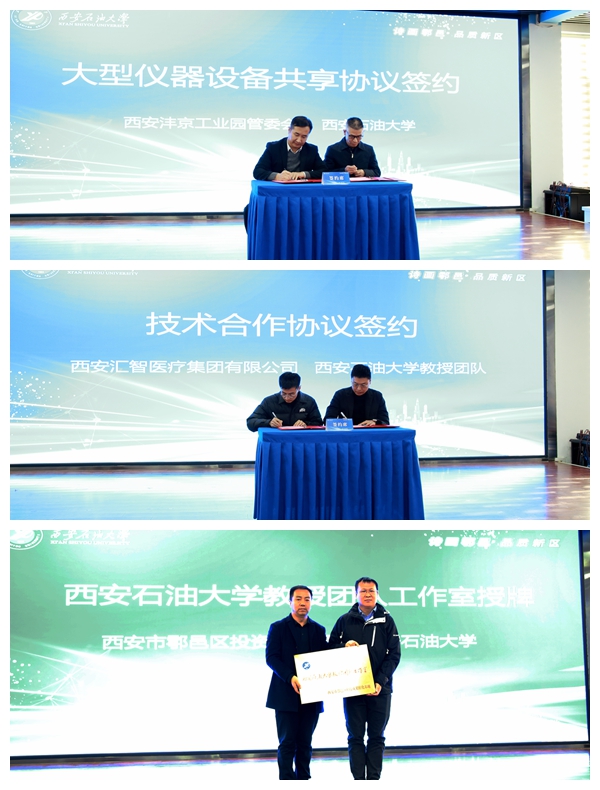 期間,實(shí)驗(yàn)室管理處負(fù)責(zé)人代表學(xué)校與灃京工業(yè)園簽訂大型儀器設(shè)備開放共享協(xié)議;化學(xué)化工學(xué)院楊博老師團(tuán)隊(duì)與西安匯智醫(yī)療集團(tuán)有限公司簽訂技術(shù)合作意向協(xié)議;科技處負(fù)責(zé)人代表學(xué)校接受灃京工業(yè)園管委會(huì)頒發(fā)的西安石油大學(xué)教授團(tuán)隊(duì)工作室牌匾。