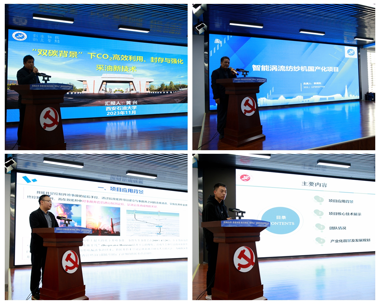 會(huì)議期間,灃京工業(yè)園管委會(huì)黨工委書記王鵬濤介紹了西安石油大學(xué)科技成果轉(zhuǎn)化基地的服務(wù)保障政策,為科研團(tuán)隊(duì)成果轉(zhuǎn)化落地提供良好的創(chuàng)業(yè)環(huán)境。石油工程學(xué)院黃興教授,電子工程學(xué)院李周利教授、黨博教授以及材料科學(xué)與工程學(xué)院翟文彥博士結(jié)合多年科技攻關(guān)和技術(shù)沉淀,分別就“雙碳背景”下二氧化碳高效利用、封存與強(qiáng)化采油新技術(shù),智能渦流紡紗機(jī)國(guó)產(chǎn)化,特種定向井電磁探測(cè)定位技術(shù),先進(jìn)抗磨耐蝕復(fù)合材料技術(shù)等展示和推介。