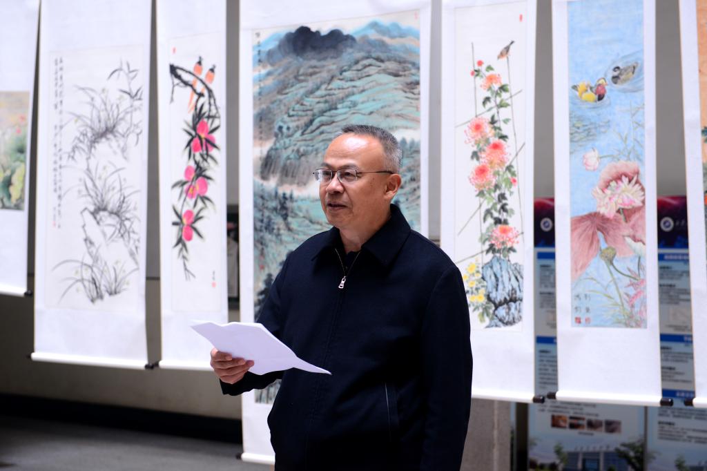 李延平致開幕詞,他首先向這次書畫展的成功舉辦表示衷心祝賀,向參加今天開幕儀式的各位書畫愛好者、各位來賓表示誠摯的歡迎,向參展嘉賓的辛勤創(chuàng)作表示感謝。他講到,中華優(yōu)秀傳統(tǒng)文化是中華民族的文化根脈,也是我們書畫愛好者創(chuàng)作的源泉。我校書畫愛好者秉承這一理念,以傳統(tǒng)筆墨描繪自己的生活,以高超技法歌頌我們的校園,展示出了我校書畫愛好者的風(fēng)采,讓我們共同感受了中華傳統(tǒng)文化的魅力,體會了視覺的沖擊,享受了色彩的絢麗。