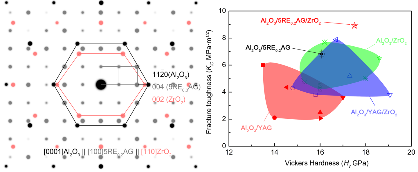 圖2 籽晶法制備Al2O3/(5Re0.2)AG/ZrO2共晶陶瓷的擇優(yōu)取向和界面關(guān)系模擬圖(左圖)和氧化鋁基共晶陶瓷力學(xué)性能對比圖(右圖)