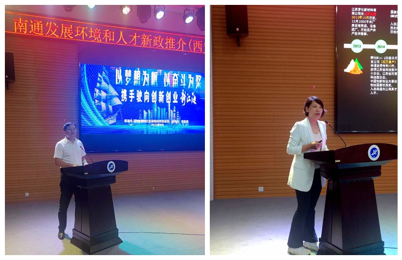 曹星暉代表人力資源和社會保障局作“南通發(fā)展環(huán)境和人才政策”推介,從產(chǎn)業(yè)提質(zhì)擴量、交通樞紐建設、營商環(huán)境優(yōu)化、城市品質(zhì)提升、生活品質(zhì)提升等方面介紹了南通市經(jīng)濟發(fā)展情況和人才新政。江蘇羅化新材料有限公司董事長羅雪方作為企業(yè)代表,結(jié)合自身創(chuàng)業(yè)經(jīng)歷分享了南通市優(yōu)質(zhì)的創(chuàng)業(yè)環(huán)境和引才留才舉措。