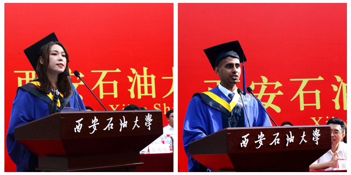石油工程學(xué)院油氣田開(kāi)發(fā)工程專業(yè)張洋同學(xué)和機(jī)械工程學(xué)院機(jī)械制造及其自動(dòng)化專業(yè)留學(xué)生海桑同學(xué)分別代表畢業(yè)研究生發(fā)言,他們分享了研究生階段的成長(zhǎng)經(jīng)歷和收獲,表達(dá)了對(duì)母校和老師的感恩之情以及立志奮發(fā)努力、勇敢前行的信心和勇氣。