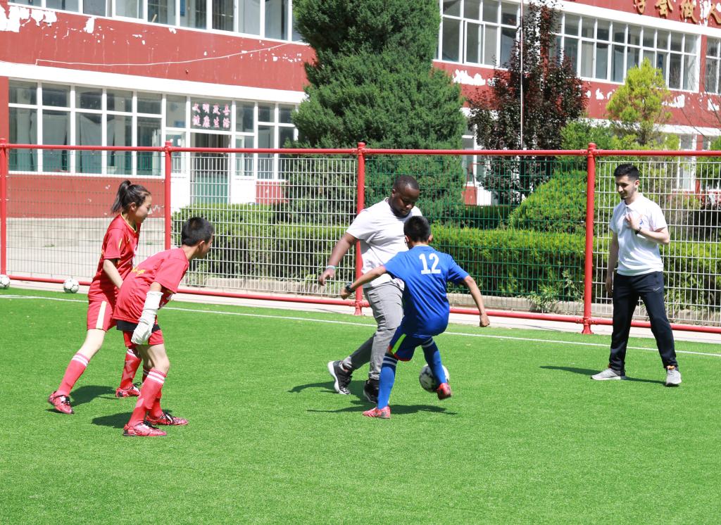 在直羅小學(xué),留學(xué)生們?yōu)樾W(xué)生們帶來了有趣生動的英語口語課。實(shí)踐教學(xué)活動是“感知中國”活動重要組成部分,在互動課堂上,小學(xué)生們與來自不同國家的留學(xué)生互動交流,來自馬來西亞的詠翰分別用中文、英文、馬來西亞語給小學(xué)生們教了生日祝福歌,來自哈薩克斯坦的小云用圖畫、猜謎游戲?yàn)樾W(xué)生們上了一堂生動活潑的英語課。有趣的英語課堂激發(fā)了小學(xué)生學(xué)習(xí)英語的熱情和濃厚的興趣,課堂氣氛熱烈,同學(xué)們發(fā)言踴躍,一節(jié)課下來小學(xué)生們意猶未盡。英語課堂外,是以“傳播快樂足球”為主題的足球互動活動,留學(xué)生與小學(xué)生們開展了一場足球友誼賽。場上,參賽隊(duì)員們齊心協(xié)力,奮勇拼搏。帶球、護(hù)球、傳球、射球,動作嫻熟,拼勁十足。就這樣,初次來到直羅小學(xué)的留學(xué)生們感受到了當(dāng)?shù)氐娘L(fēng)土人情,并對接下來與孩子們的相遇充滿了期待?;顒又?,我校專程為直羅小學(xué)帶去了50本捐贈圖書和5個(gè)嶄新足球。