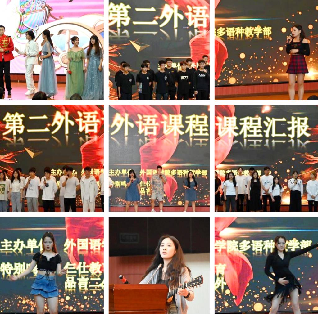 本次課程匯報在外國語學(xué)院多語種教學(xué)部教師們的精心組織和全校學(xué)習(xí)7種第二外語同學(xué)們的積極編排下,為全校師生帶來了一場國際化多語種的視聽盛宴,有效展現(xiàn)了我校第二外語的教學(xué)成果。匯報會上,多語種教學(xué)部全體教師上臺與觀眾見面,介紹學(xué)校第二外語人才培養(yǎng)理念、課程開設(shè)情況與學(xué)生學(xué)習(xí)情況。