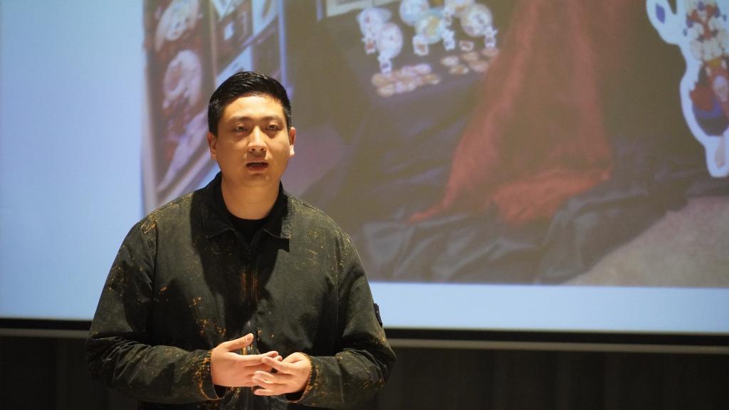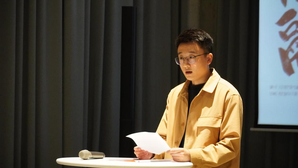 人文學(xué)院2023屆藝術(shù)碩士研究生畢中澤作為學(xué)生代表發(fā)言。他首先代表17位即將畢業(yè)的研究生感謝學(xué)校領(lǐng)導(dǎo)和相關(guān)職能部門提供的展示平臺(tái),本次展覽是同學(xué)們?cè)谏钊雽W(xué)習(xí)中國(guó)傳統(tǒng)文化、關(guān)注現(xiàn)實(shí)生活、探尋藝術(shù)規(guī)律的基礎(chǔ)上,將藝術(shù)與技術(shù)融合思考轉(zhuǎn)化為設(shè)計(jì)實(shí)踐的一次綜合嘗試,反映出同學(xué)們時(shí)刻關(guān)注社會(huì)、服務(wù)社會(huì)的創(chuàng)作初心。