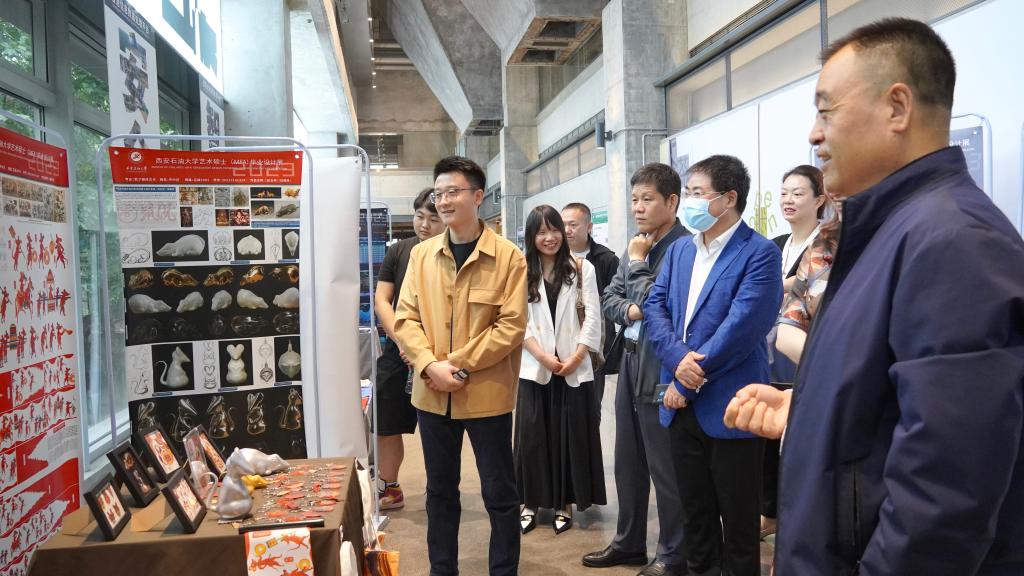 開幕式結(jié)束后,同學(xué)們?cè)诟髯哉刮磺跋蚺c會(huì)領(lǐng)導(dǎo)嘉賓詳細(xì)介紹了自己的創(chuàng)作理念和研究方法,從技藝融合的角度綜合性開展老舊礦業(yè)社區(qū)人居環(huán)境更新設(shè)計(jì)、工業(yè)遺產(chǎn)歷史風(fēng)貌區(qū)街坊改造設(shè)計(jì)、非物質(zhì)文化遺產(chǎn)保護(hù)與傳承研究、民俗民藝拓展應(yīng)用等實(shí)踐創(chuàng)新設(shè)計(jì),得到了與會(huì)嘉賓的贊揚(yáng)和好評(píng)。