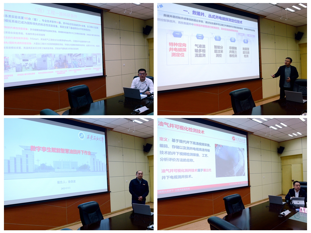 會上,勘探院工程業(yè)務(wù)部綜合辦主任李濤介紹了勘探院的基本情況以及工程一路的組織架構(gòu)和取得的主要業(yè)績。我校嚴正國、黨博、徐劍波分別匯報了所在團隊的研究成果、核心技術(shù)和推廣應(yīng)用情況。隨后,與會人員圍繞勘探開發(fā)領(lǐng)域的相關(guān)技術(shù)和合作方向進行了深入交流和探討。