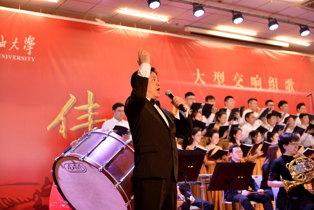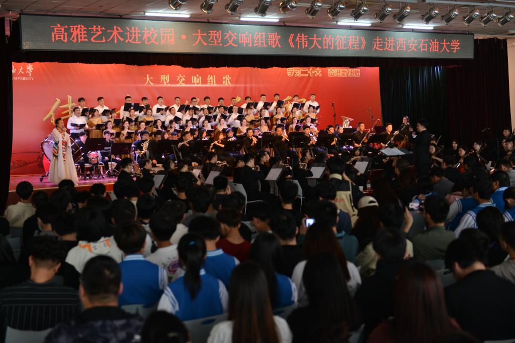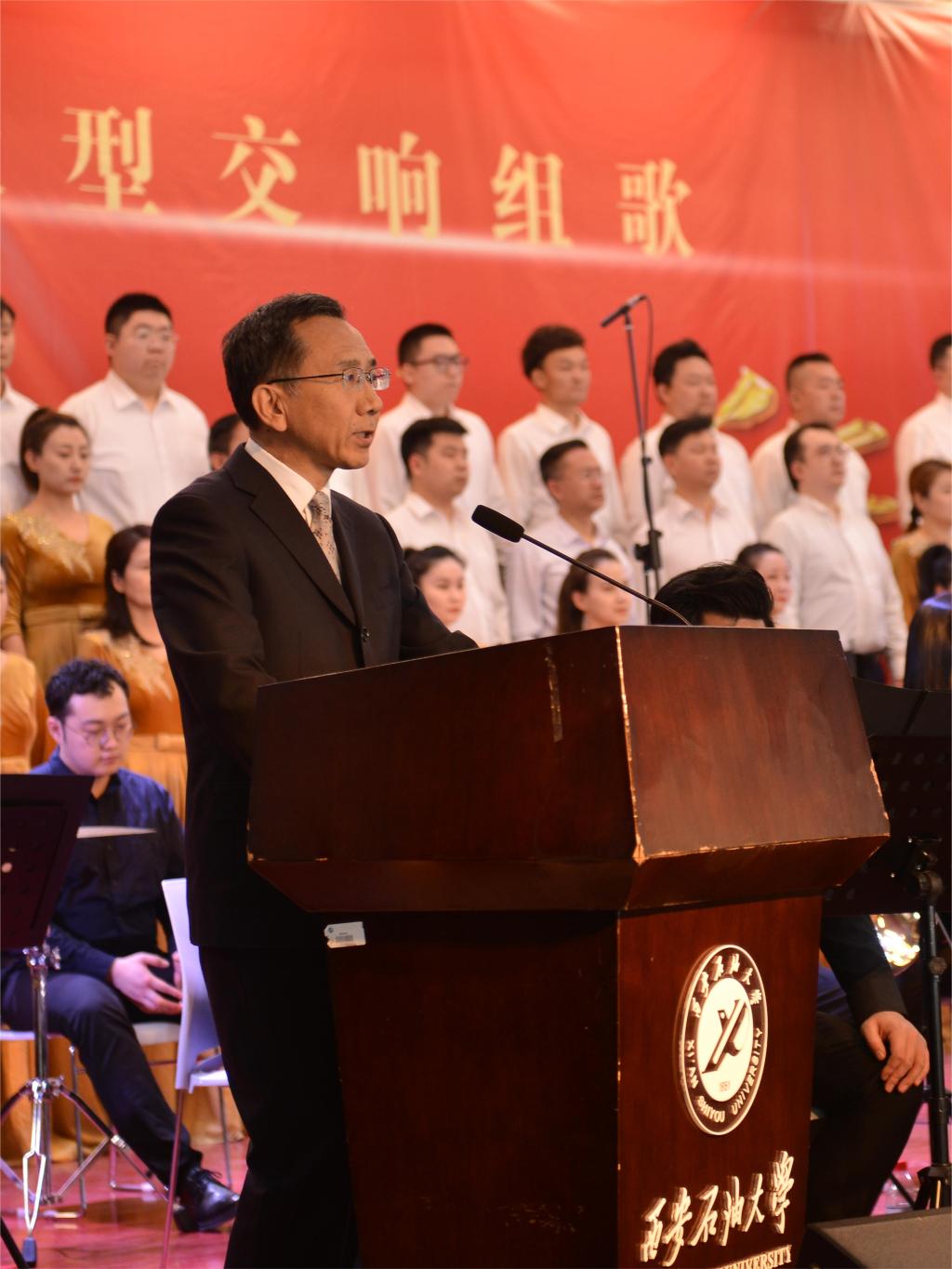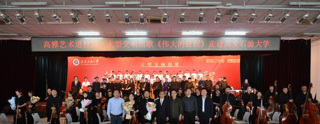 張木在演出前致辭。他首先對陜西省歌舞劇院各位演出人員的到來表示熱烈歡迎和衷心感謝,隨后講到《偉大的征程》這部大型交響組歌是對中國共產(chǎn)黨主要歷史事件的回顧,是對豐功偉業(yè)的歌頌,是對美好未來的展望,此次交響樂會是西安石油大學“音樂廳里的思政課”,藝術家們將以精彩的表演引導青年學子樹立正確審美觀,陶冶高尚的審美情操。