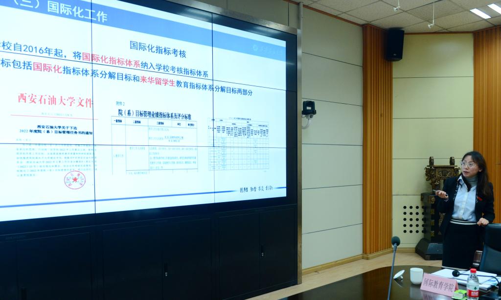 審查說明會(huì)上,國際教育學(xué)院(絲路能源學(xué)院)負(fù)責(zé)人作學(xué)校來華留學(xué)生教育及再認(rèn)證自評(píng)自改工作匯報(bào)。