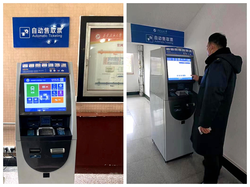 配備的火車票自動(dòng)購票機(jī)與鐵路系統(tǒng)聯(lián)網(wǎng),功能齊全,操作簡單,可以為廣大師生提供購票、改簽、退票、取報(bào)銷憑證、聯(lián)系方式預(yù)留/變更、優(yōu)惠資質(zhì)采集、行程信息提示等火車票購取便捷服務(wù),與西安火車站設(shè)置的自動(dòng)售票機(jī)功能相同。
