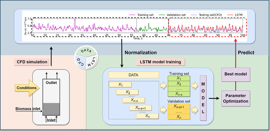 該研究成果基于精準(zhǔn)的生物質(zhì)流化床快速熱解CFD模擬數(shù)據(jù),結(jié)合深度學(xué)習(xí)模型開發(fā)了一種基于長短期記憶神經(jīng)網(wǎng)絡(luò)的CFD模擬智能加速方法。該方法能夠快速預(yù)測反應(yīng)器出口的產(chǎn)品流率,在保證足夠高預(yù)測精度的前提下降低至少30%的CFD計算需求,同時對不同工況均具有良好的適用性。研究成果為流化床生物質(zhì)快速熱解反應(yīng)器的智能設(shè)計優(yōu)化提供了一條重要途徑,能夠促進生物質(zhì)資源高效利用技術(shù)的開發(fā)及應(yīng)用,有助于我國“雙碳”目標(biāo)的實現(xiàn)。