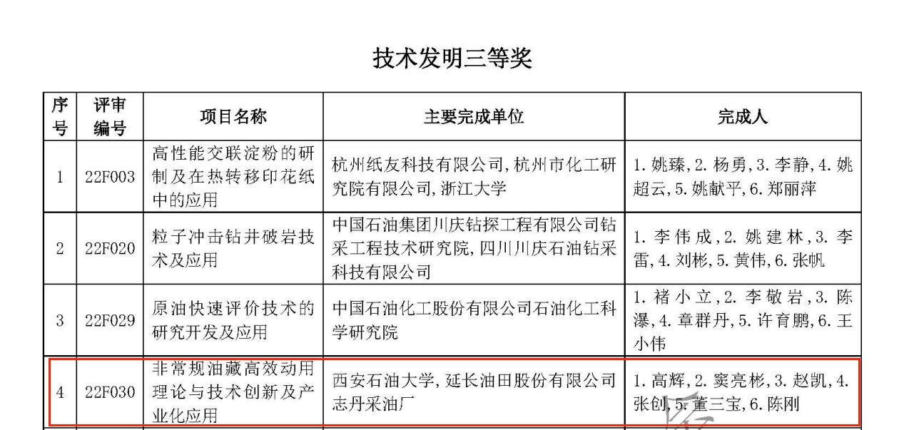 劉順教授參與完成的“非常規(guī)儲層雙暫堵壓裂改造關(guān)鍵技術(shù)與應(yīng)用 ”榮獲中國石油和化學(xué)工業(yè)聯(lián)合會科技進(jìn)步一等獎。高輝教授團(tuán)隊主持完成的“非常規(guī)油藏高效動用理論與技術(shù)創(chuàng)新及產(chǎn)業(yè)化應(yīng)用 ”榮獲中國石油和化學(xué)工業(yè)聯(lián)合會技術(shù)發(fā)明三等獎。張益教授團(tuán)隊主持完成的“鄂爾多斯盆地非常規(guī)氣藏高效開發(fā)關(guān)鍵理論與技術(shù)”和黃興副教授團(tuán)隊主持完成的“CO2提高油氣采收率與地質(zhì)埋存關(guān)鍵理論技術(shù)創(chuàng)新及應(yīng)用 ”兩項成果榮獲中國石油和化學(xué)工業(yè)聯(lián)合會科技進(jìn)步三等獎。