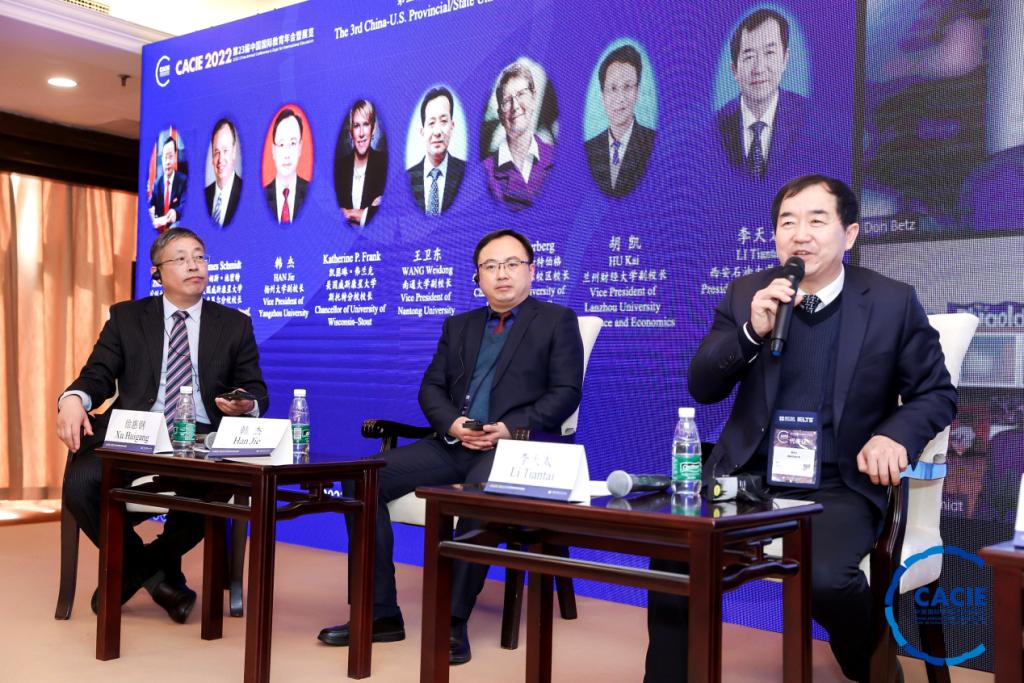作為本屆年會(huì)的重要組成部分,第三屆中美省州大學(xué)校長(zhǎng)論壇以線上+線下形式舉行,來(lái)自170多所中美高校的代表出席,邀請(qǐng)中美12所高校的校長(zhǎng)作為發(fā)言和研討嘉賓。我校校長(zhǎng)李天太是陜西高校唯一特邀論壇嘉賓。論壇主題為探索中美省州大學(xué)產(chǎn)教融合新模式,提高國(guó)際化人才培養(yǎng)質(zhì)量,服務(wù)地方經(jīng)濟(jì)社會(huì)新發(fā)展。論壇研討內(nèi)容包括以中美學(xué)分互認(rèn)、學(xué)位聯(lián)授項(xiàng)目為基礎(chǔ),以國(guó)際化人才培養(yǎng)為紐帶,構(gòu)建高水平、寬領(lǐng)域、可持續(xù)的中美省州高校合作交流平臺(tái)。通過(guò)教育國(guó)際交流打造適應(yīng)國(guó)家發(fā)展需求的新工科、新農(nóng)科、新商科等高質(zhì)量專(zhuān)業(yè)學(xué)科群,建設(shè)具有國(guó)際化水平的師資隊(duì)伍,加強(qiáng)中美高校之間學(xué)術(shù)科研合作,通過(guò)產(chǎn)教融合模式強(qiáng)化合作共贏理念,推進(jìn)中美省州高校教育交流、人才培養(yǎng)、校企合作、科研合作、人文交流等,為地方經(jīng)濟(jì)社會(huì)發(fā)展服務(wù)。
