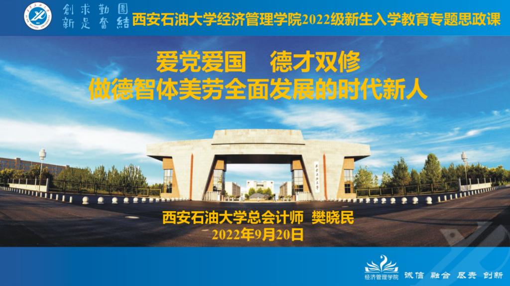 為幫助新生入學(xué)后盡快融入校園環(huán)境、積極面對(duì)大學(xué)生活、全身心投入專業(yè)學(xué)習(xí),順利實(shí)現(xiàn)角色轉(zhuǎn)變,引導(dǎo)學(xué)生努力成長(zhǎng)為社會(huì)主義合格建設(shè)者和可靠接班人而奮斗,9月20日,總會(huì)計(jì)師樊曉民以《愛黨愛國,德才雙修,做德智體美勞全面發(fā)展的時(shí)代新人》為題,圍繞文化知識(shí)教育、愛國主義教育、思想品德教育和理想信念教育等方面內(nèi)容,用深入淺出的理論講解、圖文并茂的案例分析和生動(dòng)形象的個(gè)人經(jīng)歷為經(jīng)濟(jì)管理學(xué)院2022級(jí)新生講授專題思政課。