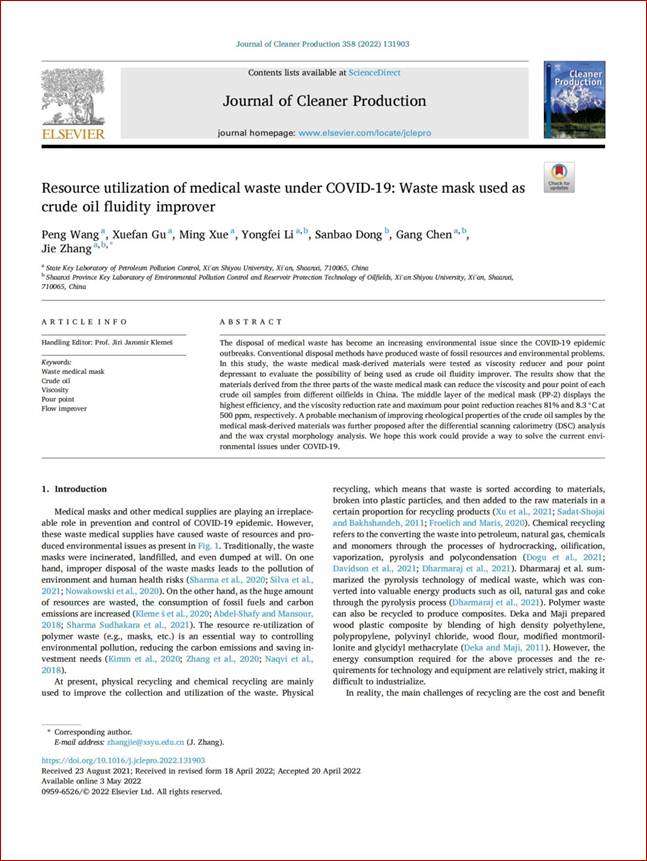 該項研究工作近期以“Resource utilization of medical waste under COVID-19: Waste mask used as crude oil fluidity improver”為題發(fā)表在Journal of Cleaner Production(中科院一區(qū),TOP期刊,2021年IF=9.297)期刊上。張潔教授和顧雪凡教授共同指導,碩士研究生王棚為論文第一作者,張潔教授為通訊作者,西安石油大學為第一單位。