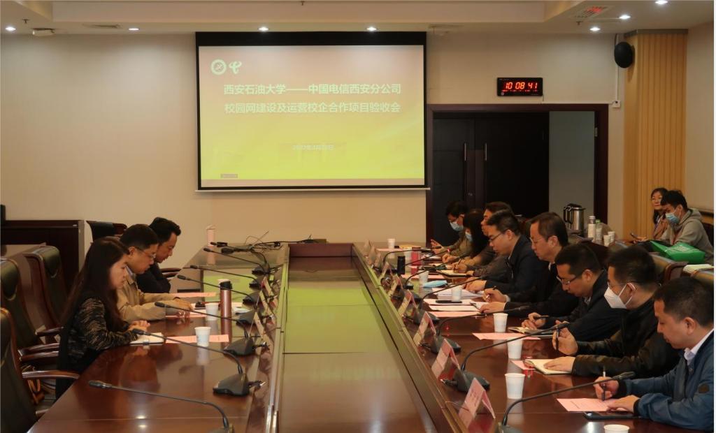 4月28日上午,學(xué)校在鄠邑校區(qū)圖書館第二會議室召開“西安石油大學(xué)—中國電信股份有限公司西安分公司 校園網(wǎng)建設(shè)及運營校企合作項目”驗收會。學(xué)校網(wǎng)絡(luò)安全與信息化工作領(lǐng)導(dǎo)小組副組長、副校長張榮軍,中國電信股份有限公司西安分公司副總經(jīng)理楊帆出席會議,學(xué)校黨政辦公室、學(xué)生工作部(處)、保衛(wèi)部(處)、審計處、財務(wù)處、國有資產(chǎn)處、資產(chǎn)經(jīng)營處、基建處、后勤處等學(xué)校網(wǎng)絡(luò)安全與信息化工作領(lǐng)導(dǎo)小組成員單位負(fù)責(zé)人以及西安電信校園運營中心總經(jīng)理王建成、總監(jiān)楊莎莎參加會議,會議由信息中心主任王學(xué)龍主持。