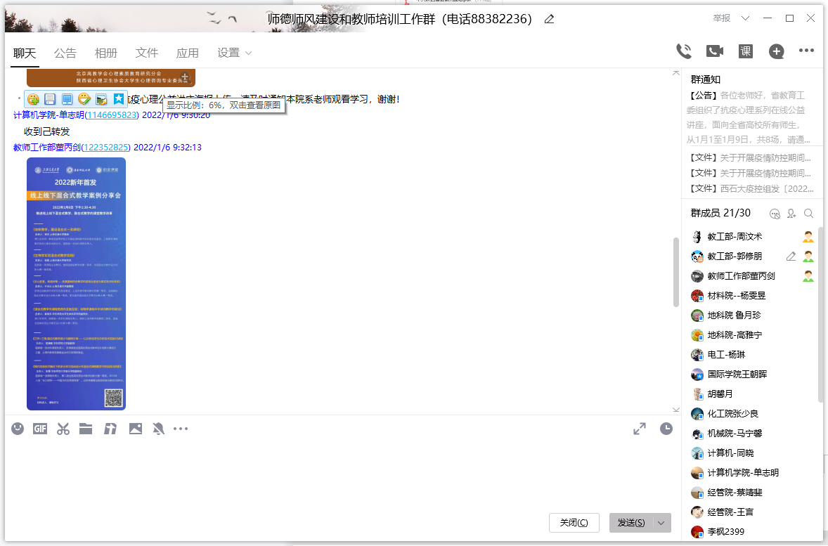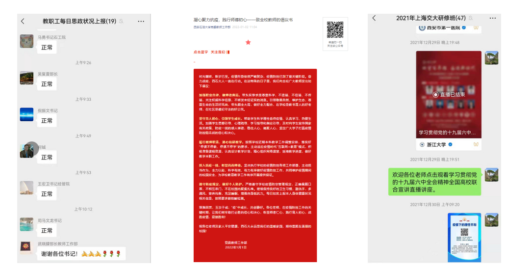 思想政治教育全覆蓋,強(qiáng)化教職工思想引領(lǐng)。建立學(xué)校教職工思想政治狀況信息群,各院(系)級(jí)單位黨組織書(shū)記在群內(nèi)每天上報(bào)本單位教職工思想政治狀況,精準(zhǔn)排查不漏一人,加強(qiáng)觀測(cè)引導(dǎo),對(duì)全校教職工思想政治狀況切實(shí)做到底子清、情況明、措施實(shí)。發(fā)出《致全校教師的倡議書(shū)》,組織教師線上觀看學(xué)習(xí)貫徹黨的十九屆六中全會(huì)精神全國(guó)高校聯(lián)合宣講直播講座,在部門(mén)所屬各教師群內(nèi)轉(zhuǎn)發(fā)疫情防控法律法規(guī),教育教師在學(xué)校做好老師,在社區(qū)做好公民。