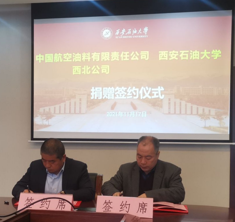 11月17日上午,我校與中國航空油料有限責任公司西北公司捐贈簽約儀式在鄠邑校區(qū)圖書館第二會議室舉行,中國航空油料有限責任公司西北公司副總經(jīng)理陳少華,我校副校長陳軍斌出席捐贈簽約儀式。儀式由實驗室管理處處長時保宏主持。