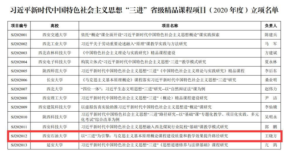 近日,省委教育工委發(fā)布了《中共陜西省委教育工委關(guān)于習(xí)近平新時代中國特色社會主義思想“三進(jìn)”省級精品課程項目(2020 年度)立項的通知》,全省共有25項課程項目予以立項。我校馬克思主義學(xué)院王曉方教授申報的《以“三進(jìn)”為引擎:馬克思主義基本原理概論課程建設(shè)質(zhì)量和教學(xué)效果提升路徑研究》入選立項名單。
