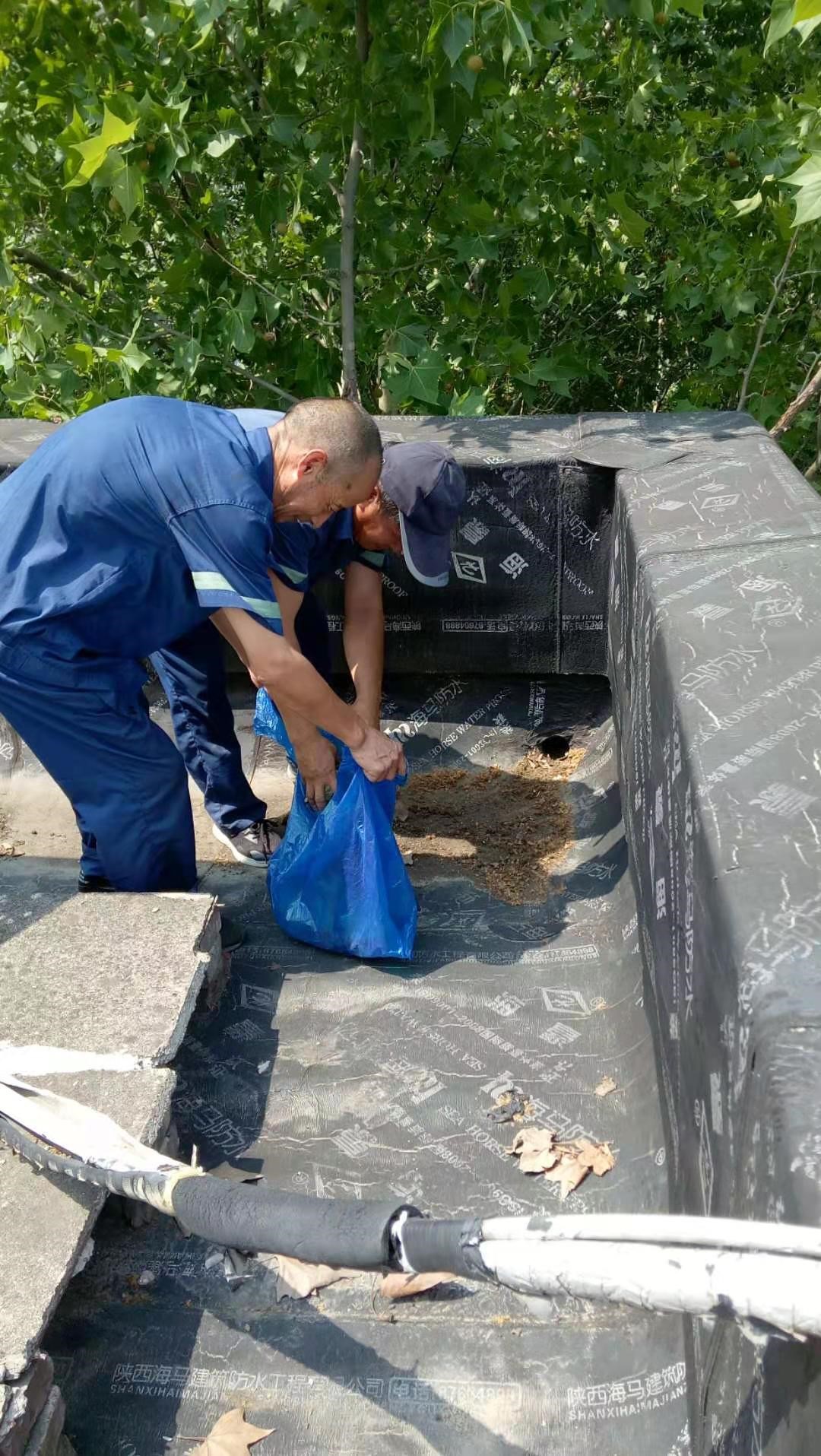 工作人員清理雁塔校區(qū)住宅樓樓頂雨水排水管口