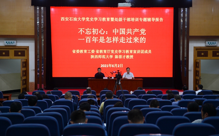 根據(jù)省委教育工委、省教育廳統(tǒng)一部署,結合學校年度干部培訓工作安排,6月2日上午,省委教育工委省教育廳宣講團走進我校,開展黨史學習教育暨處級干部培訓專題輔導報告會。宣講團成員、陜西師范大學陳答才教授以《不忘初心:中國共產(chǎn)黨一百年是怎樣走過來的》為題,在雁塔校區(qū)學術報告廳作報告。校黨政領導李延平、張木、陳軍斌、李華、蘇文甫、程永清、樊曉民等出席報告會。報告會由校黨史學習教育領導小組副組長、校黨委副書記雷西合主持。
