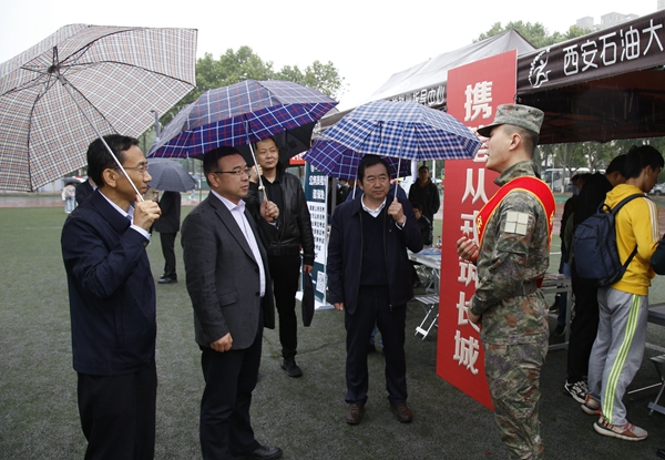 4月23日上午,陜西省2021屆普通高校能源化工類畢業(yè)生聯(lián)盟招聘活動在我校雁塔校區(qū)舉辦。陜西省教育廳副廳長高嶺、學工部部長唐澍、二級調(diào)研員胡偉安、西北大學副校長奚家米、西安理工大學黨委副書記馬寧、西安建筑科技大學黨委副書記張志昌、陜西科技大學黨委副書記王道安、西安科技大學黨委副書記陳春林、西安工業(yè)大學黨委副書記梁云鶴、陜西國防職業(yè)技術(shù)學院副院長張永軍、陜西交通職業(yè)技術(shù)學院副院長董梅、陜西能源職業(yè)技術(shù)學院副院長趙新法等10所院校負責畢業(yè)生就業(yè)工作的校領(lǐng)導及27所聯(lián)盟高校就業(yè)部門負責同志參加了招聘活動。我校校長李天太、黨委副書記張木全程陪同。