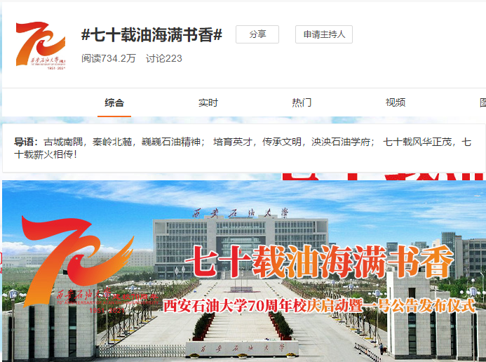 [70周年校慶]我校微博熱搜“七十載油海滿(mǎn)書(shū)香”閱讀量達(dá)730萬(wàn)余人次