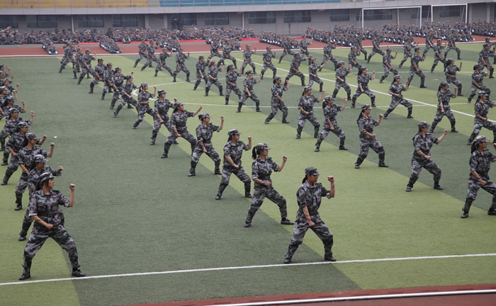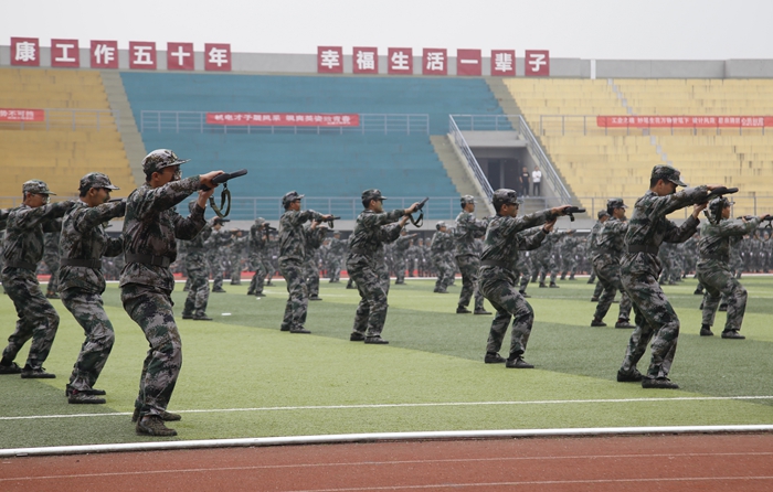 伴隨著激昂的進行曲和嘹亮的口號,2020級本科生分12個方陣,邁著整齊矯健的步伐,精神飽滿地經過主席臺,向全校師生展示隊列訓練成果。隊列成果展示后,2020級本科新生分別進行了捕俘刀、軍體拳、刺殺操、手語操等科目的表演。