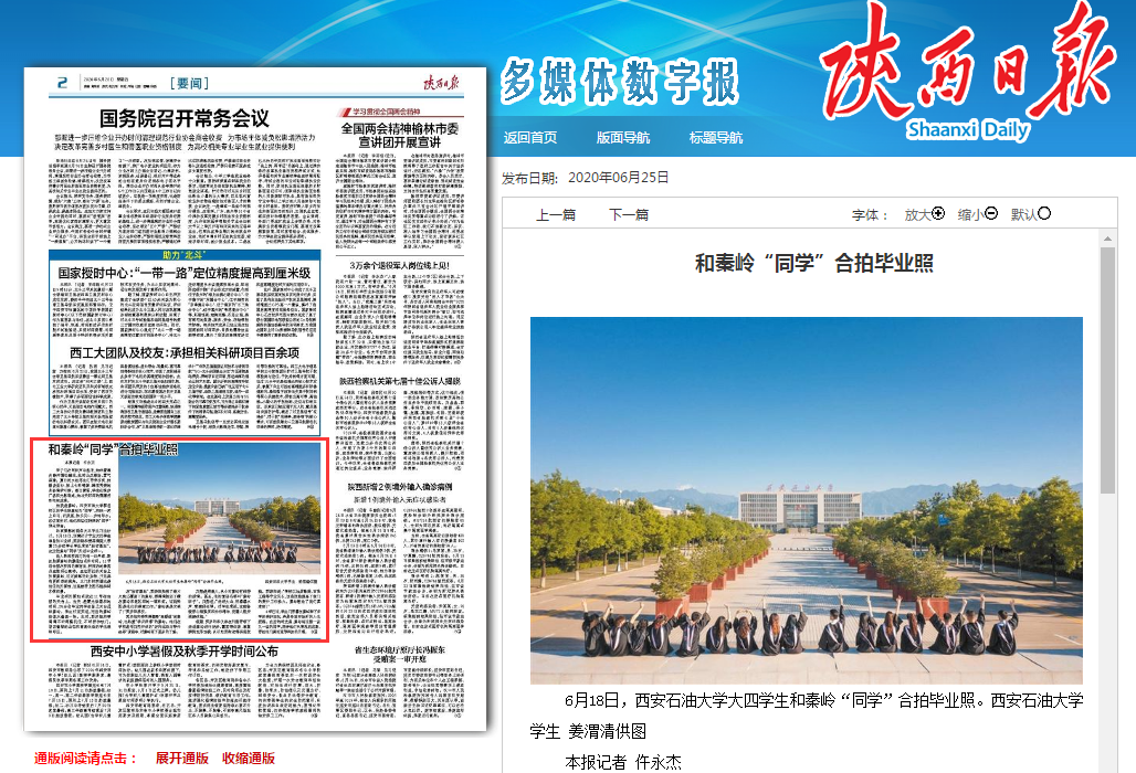 6月25日,《陜西日報》2版刊登的《和秦嶺“同學”合拍畢業(yè)照》一文,對我校師生進行了報道。