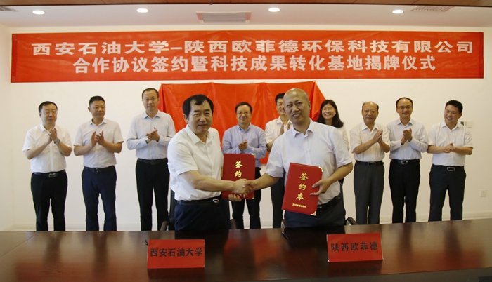 6月8日下午,我校校長李天太、副校長李華,相關部門及學院負責人一行10人赴陜西歐菲德環(huán)??萍加邢薰咀咴L交流。走訪期間,雙方簽署了戰(zhàn)略合作協(xié)議并揭牌成立了“西安石油大學科技成果轉(zhuǎn)化基地”“西安石油大學學生實踐基地”“西安石油大學研究生聯(lián)合培養(yǎng)基地”。陜西歐菲德環(huán)??萍加邢薰径麻L卜濤(采92級校友)及領導班子成員出席簽約儀式,公司總經(jīng)理李熙民(采88級校友)主持儀式。