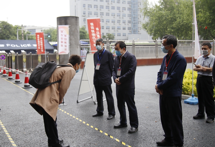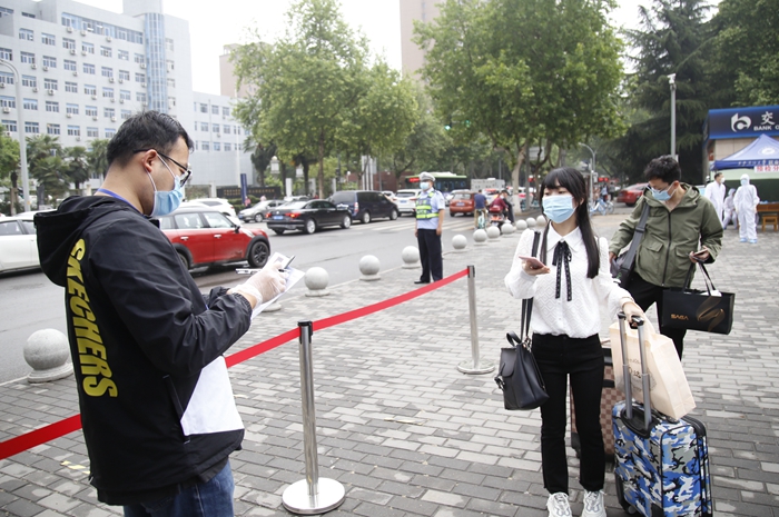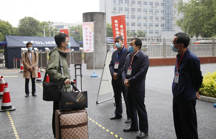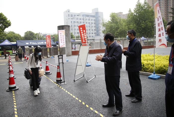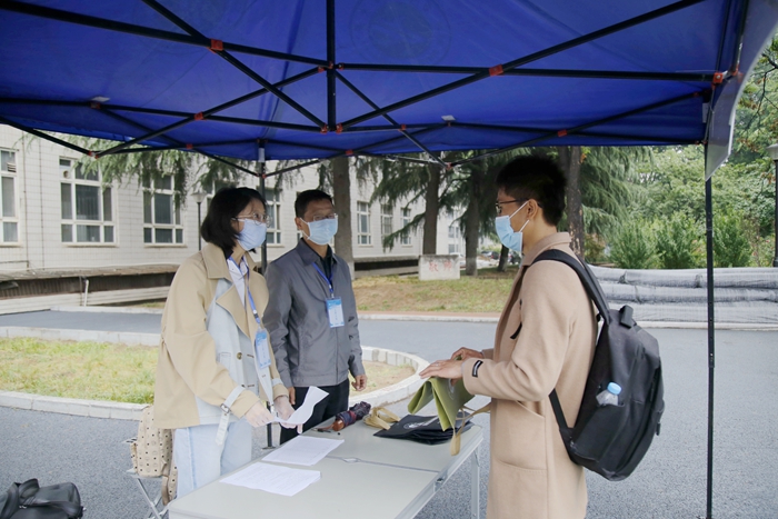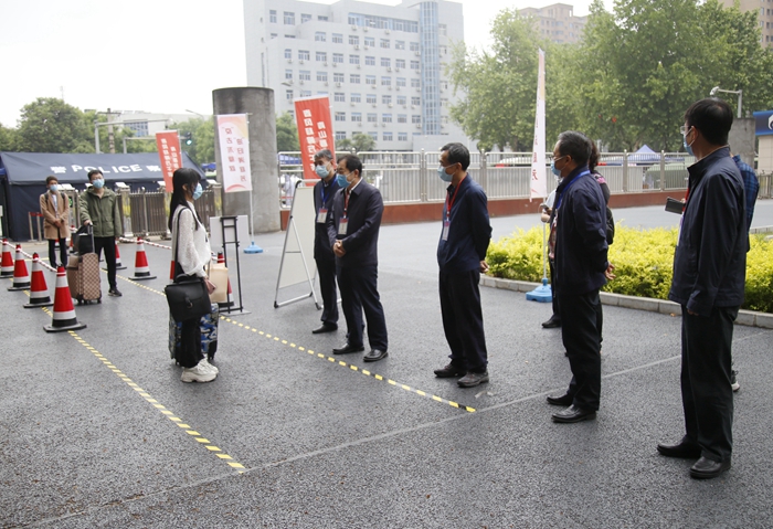 57日上午9時(shí),首位返校學(xué)生、經(jīng)濟(jì)管理學(xué)院研究生劉雪夢(mèng)順利抵達(dá)學(xué)校。在現(xiàn)場(chǎng)工作人員的指引下,劉雪夢(mèng)依次完成了更換口罩、測(cè)量體溫、行李和手部消毒、核查健康碼(綠碼)、身份核實(shí)等流程后順利進(jìn)入校園。校黨政領(lǐng)導(dǎo)賽云秀、李天太、張木、李華、蘇文甫、程永清先后到報(bào)到區(qū)迎接返校同學(xué),校領(lǐng)導(dǎo)與同學(xué)們親切交談,對(duì)返校同學(xué)表示歡迎,深入了解大家的思想狀況、身體狀況、假期學(xué)習(xí)生活、論文撰寫情況、就業(yè)情況。校領(lǐng)導(dǎo)鼓勵(lì)同學(xué)們堅(jiān)定戰(zhàn)勝疫情的信心,嚴(yán)格落實(shí)學(xué)校、學(xué)院各項(xiàng)疫情防控措施,同時(shí)要珍惜最后的校園時(shí)光,順利完成學(xué)業(yè)任務(wù)。