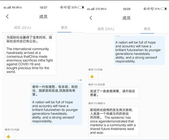 為了激發(fā)學生學習興趣,提升專業(yè)水平,學院團委組織開展了各年級“雙語學”主題班團會,集體學習《中國日報China Daily》頭條英文播報中《習近平總書記給北京大學援鄂醫(yī)療隊全體“90后”黨員的回信》雙語版,將總書記給青年的兩篇回信結(jié)合起來學,要求每位同學撰寫心得體會,分享交流,做好思想引領(lǐng)與啟迪。