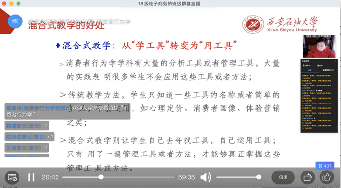 經(jīng)濟(jì)學(xué)系和管理科學(xué)與工程系。為了保障教學(xué)效果,經(jīng)濟(jì)學(xué)系和管科系的老師們也積極踐行“線上”+“線下”的混合式教學(xué)方式,將在線教學(xué)和傳統(tǒng)教學(xué)的優(yōu)勢結(jié)合起來,把學(xué)習(xí)者的學(xué)習(xí)由淺到深地引向深度學(xué)習(xí)。老師們提前制定預(yù)案,從課程準(zhǔn)備、課程資源、課堂教學(xué)、師生互動(dòng)、指導(dǎo)答疑和作業(yè)考評(píng)等方面進(jìn)行教學(xué)設(shè)計(jì)和思考。課程多采用多平臺(tái)相結(jié)合方式進(jìn)行開展,如中國mooc課程+釘釘直播教學(xué)+釘釘/微信。選用中國mooc平臺(tái)的“國家精品課”開展基礎(chǔ)知識(shí)學(xué)習(xí);通過釘釘直播,開展與章節(jié)內(nèi)容相關(guān)的消費(fèi)者行為學(xué)問題討論;通過釘釘班級(jí)群/微信群,發(fā)布學(xué)習(xí)重難點(diǎn)、作業(yè),保障溝通的及時(shí)性。這種多平臺(tái)相結(jié)合的形式,既拓展了學(xué)生自主學(xué)習(xí)能力、鍛煉了學(xué)生學(xué)以致用的思辨能力,更重要的是培養(yǎng)學(xué)生們做“建設(shè)者”的意識(shí),學(xué)生反饋效果良好。