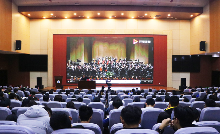 高賀杰老師以一幅圖為引,延伸到聲音。他指出,聲音是傳遞信息的一種基本方式,聲音延伸出音樂(lè),“聰,耳聞而循心通上”,聰(聽(tīng))是一個(gè)人智慧的標(biāo)志。隨后,高老師列舉不同領(lǐng)域名家實(shí)例詮釋音樂(lè),并為同學(xué)們闡釋了怎樣聽(tīng)音樂(lè)以及聽(tīng)音樂(lè)的禮儀。他強(qiáng)調(diào),音樂(lè)是需要想象力的,因?yàn)橐魳?lè)的無(wú)造型性、無(wú)語(yǔ)義性,所以聽(tīng)聲聯(lián)想畫(huà)面能更深層次的體會(huì)其內(nèi)涵。最后,高老師為同學(xué)們播放并解析著名音樂(lè)家柴科夫斯基的《1812序曲》,使同學(xué)們感受到交響樂(lè)的魅力。