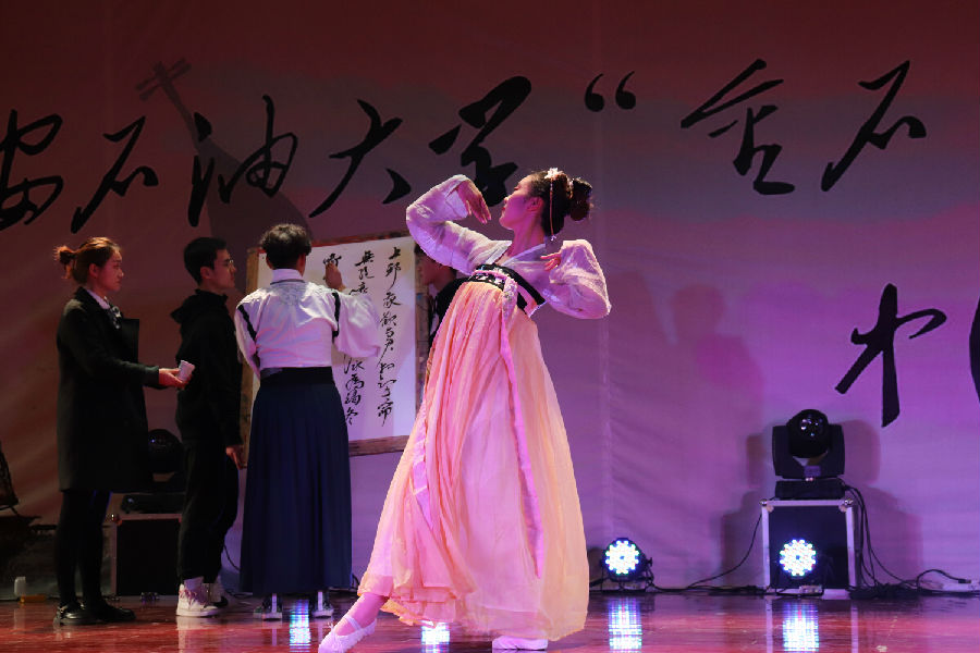 接下來音樂會正式開始。一首婉轉(zhuǎn)悠揚的陜北民歌《叫一聲哥哥快回來》將我們帶入傳統(tǒng)民族音樂氛圍中;接著又是動態(tài)美與民族美的結(jié)合,哈薩克族的同學(xué)們獻(xiàn)出動感十足的民族舞蹈;長笛與二胡奏出一曲“美麗的神話”;人文學(xué)院與材料學(xué)院同學(xué)合作演出京劇《春閨夢》;藏族姑娘卓爾丹舞出莊重優(yōu)美的《轉(zhuǎn)山》,新疆小伙彈著冬不拉唱起《明月思故鄉(xiāng)》……最后,人文學(xué)院盧強老師帶領(lǐng)兩位學(xué)生在動聽的中國古典音樂和舞蹈的背景下?lián)]毫潑墨,創(chuàng)作了精彩的書法作品。
