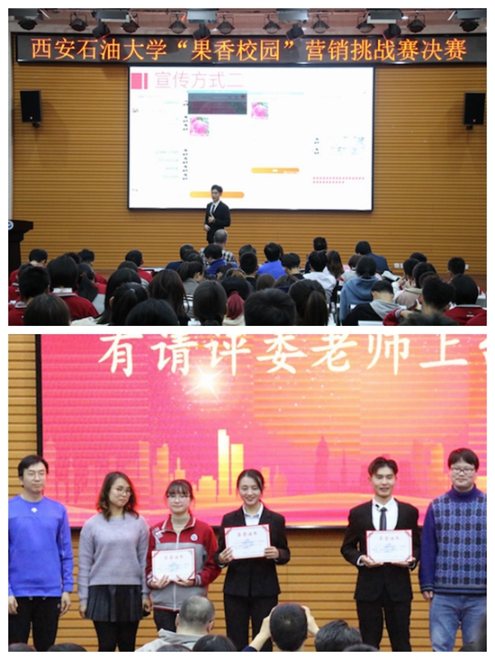 3.增強愛國主義教育,舉辦扶貧類專業(yè)競賽。11月18日晚,“守初心、擔使命,師生融合助扶貧——西安石油大學首屆‘果香校園’營銷挑戰(zhàn)賽決賽”在鄠邑校區(qū)經(jīng)管人文樓118多功能廳成功舉辦。時值“不忘初心、牢記使命”主題教育,校團委和經(jīng)濟管理學院將立德樹人落實到具體行動,積極促成本次活動;企業(yè)管理系教工黨支部和企業(yè)管理系學生黨支部充分發(fā)揮師生融合力,由該系老師作為指導教師,該系學生黨支部協(xié)同營銷協(xié)會作為活動的組織者,守初心、擔使命,為全校同學帶來了一次鮮活生動的思想政治教育和專業(yè)建設活動?;顒庸参?00多名同學,積極獻計獻策,通過實踐活動服務三農,助力扶貧,彰顯了我校青年學子愛國愛家的優(yōu)秀品質。據(jù)悉,本次比賽,歷時一個月左右,共有來自全校434名同學報名參賽。參加決賽的12支團隊,共銷售蘋果1673余箱,為當?shù)毓r增收100380元。