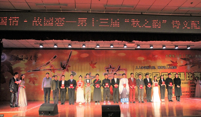 本次比賽的主題是“家國情?故園戀”,經(jīng)過歷時兩個月的班級預(yù)賽、院系復(fù)賽,最終23組選手進入決賽。經(jīng)過激烈的角逐,最終來自人文學(xué)院的《長安之眼》以及石油工程學(xué)院的《為國思》榮獲一等獎;化學(xué)化工學(xué)院的《祖國頌》、經(jīng)濟管理學(xué)院的《進擊的中國》等七個節(jié)目榮獲二等獎;來自理學(xué)院的《七子之歌》、音樂系的《滿江紅》等十四個節(jié)目榮獲三等獎。