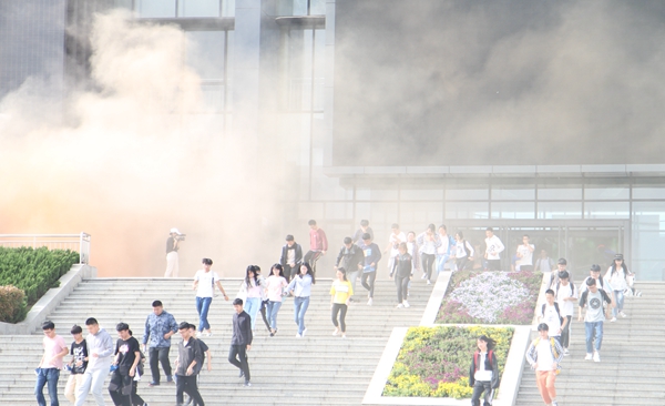 講座結(jié)束后,保衛(wèi)處聯(lián)合學(xué)生處、圖書館,在化學(xué)化工學(xué)院、電子工程學(xué)院、機械工程學(xué)院、計算機學(xué)院、經(jīng)濟管理學(xué)院的支持下,組織500余名學(xué)生在鄠邑校區(qū)圖書館進行了防火避震應(yīng)急疏散逃生演練。為了模擬火災(zāi)現(xiàn)場的煙霧場景,在圖書館南門兩側(cè)燃放了消防演習(xí)煙霧彈,隨著警報信號的發(fā)出,同學(xué)們有序地離開圖書館,500余名師生在5分鐘內(nèi)安全撤離到達(dá)指定地點。