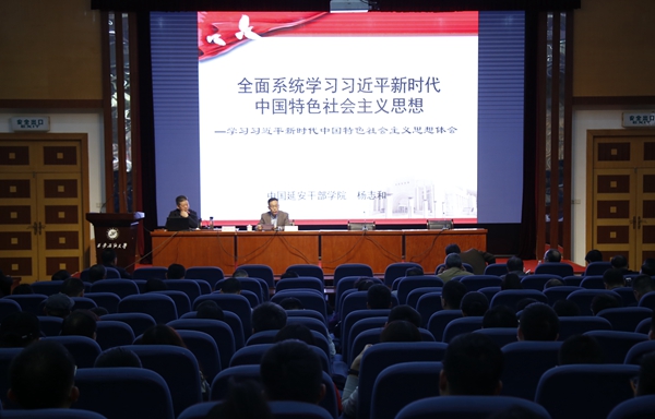 楊志和教授在題為《全面系統(tǒng)學(xué)習(xí)習(xí)近平新時(shí)代中國(guó)特色社會(huì)主義思想》的報(bào)告中,全面系統(tǒng)地解讀了習(xí)近平新時(shí)代中國(guó)特色社會(huì)主義思想的精神實(shí)質(zhì),將習(xí)近平總書(shū)記系列重要講話精神概括總結(jié)為“一個(gè)主題、一個(gè)目標(biāo)、一條紅線、一個(gè)理念”。報(bào)告以中國(guó)特色社會(huì)主義觀、民族復(fù)興觀、全面改革觀、科學(xué)發(fā)展觀、民主政治與法治觀、意識(shí)形態(tài)觀、國(guó)際戰(zhàn)略觀、黨建觀這“八大觀”為邏輯脈絡(luò),詳細(xì)闡述了深入學(xué)習(xí)領(lǐng)會(huì)習(xí)近平新時(shí)代中國(guó)特色社會(huì)主義思想的重大理論意義和實(shí)踐意義。