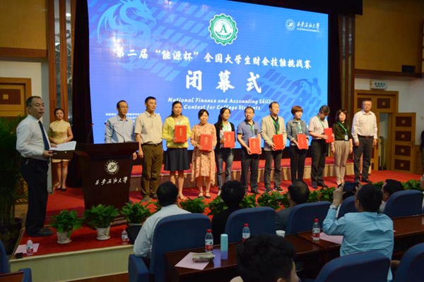 頒獎典禮上,張國才副理事長、李天太副校長為特等獎獲得者頒獎。中國石油集團石油管道工程技術(shù)研究院院長、黨委書記劉亞旭,廣東財經(jīng)大學原校長王華為一等獎獲得者頒獎。西安電子科技大學總會計師謝軍占、陜西延長石油(集團)有限責任公司總會計師康永智為二等獎獲得者頒獎。我校原總會計師楊恒倉、經(jīng)管院教授趙選民、廣州市福斯特科技有限公司董事長閆曉霞為三等獎獲得者頒獎。陜西省國稅局科研所副所長劉峰、圓通制創(chuàng)立者王民權(quán)、中國節(jié)能環(huán)保裝備股份有限公司財務(wù)總監(jiān)李強、廣州市福斯特科技有限公司總經(jīng)理楊帆為優(yōu)秀組織獎獲得單位頒獎。我校實驗室管理處處長孟開元、經(jīng)濟管理學院黨委書記閆大維、經(jīng)濟管理學院院長王君萍、教務(wù)處副處長張君濤為優(yōu)秀指導教師頒獎。