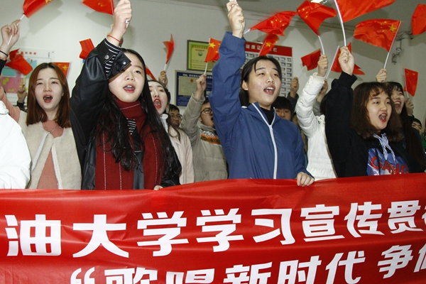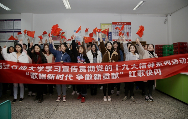 “紅歌快閃”活動(dòng)僅僅是西安石油大學(xué)學(xué)習(xí)宣傳貫徹黨的十九大精神的系列活動(dòng)之一。學(xué)校將學(xué)習(xí)宣傳貫徹黨的十九大精神作為當(dāng)前和今后一個(gè)時(shí)期的首要政治任務(wù),通過(guò)中心組學(xué)習(xí)、專家報(bào)告會(huì)、組織生活會(huì)、青年教師座談會(huì)、學(xué)生黨員座談會(huì)等形式,通過(guò)報(bào)紙、廣播、電視、網(wǎng)絡(luò)、微信、櫥窗等多種媒體,注重網(wǎng)上網(wǎng)下全覆蓋,積極創(chuàng)新形式,緊貼青年學(xué)生實(shí)際,運(yùn)用H5、圖解圖說(shuō)、網(wǎng)絡(luò)直播等接地氣、形象化、通俗化的方式,注重在春風(fēng)化雨、潤(rùn)物無(wú)聲中宣傳黨的十九大精神,不斷提高學(xué)習(xí)宣傳教育的親和力和實(shí)效性。