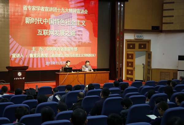 11月29日下午,我校在雁塔校區(qū)學(xué)術(shù)報(bào)告廳舉辦了省專(zhuān)家學(xué)者宣講團(tuán)黨的十九大精神宣講會(huì)。省專(zhuān)家學(xué)者宣講團(tuán)成員、西安理工大學(xué)馬克思主義學(xué)院院長(zhǎng)魯寬民教授擔(dān)任主講。校黨委理論中心組成員、全校處科級(jí)干部、教工黨支部書(shū)記、馬克思主義學(xué)院教師、大學(xué)生思想政治輔導(dǎo)員參加宣講會(huì)。校黨委副書(shū)記雷西合主持會(huì)議。