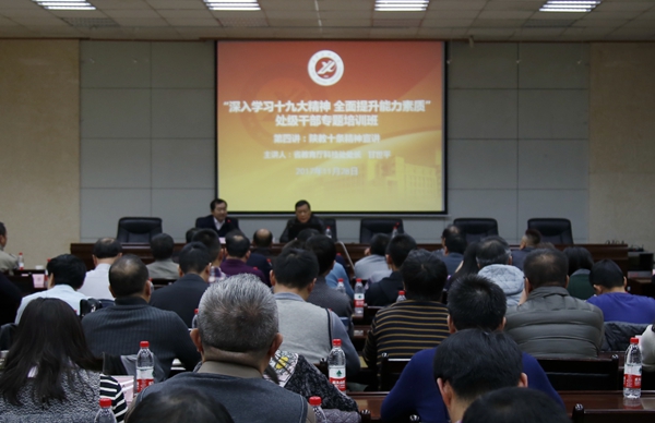 11月28日下午,我?!吧钊雽W(xué)習(xí)黨的十九大精神,全面提升能力素質(zhì)”處級(jí)干部專題培訓(xùn)班第四講在雁塔校區(qū)會(huì)議中心第三會(huì)議室舉辦。省教育廳科技處處長(zhǎng)甘世平應(yīng)邀來(lái)校作報(bào)告,副校長(zhǎng)李天太主持報(bào)告會(huì),全校處級(jí)干部參加報(bào)告會(huì)。