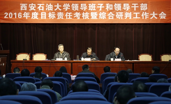 3月24日上午,省委組織部、省委高教工委在我校學術報告廳召開了西安石油大學領導班子和領導干部2016年度目標責任考核暨綜合研判工作大會。省屬高校領導班子和領導干部目標責任考核暨綜合研判第二工作小組組長、陜西省干部教育辦公室副主任郭文超出席會議并講話。校黨委書記賽云秀主持大會。省紀委駐教育廳紀檢組副組長易紅彬、省教育廳離退處副處長王亞麗、省委組織部宣教干部處主任科員李芃、省委高教工委組織部干部馮政清、西安理工大學人事處干部程瑤等考核組成員,我校校領導、校黨委委員、紀委委員、學術委員會委員、工會委員,正高職稱專業(yè)技術人員,正處級以上領導干部,市級以上人大代表、政協(xié)委員,民主黨派主要負責人,近三年退休的校級領導干部參加大會。