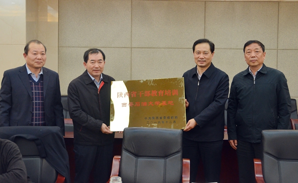 省委組織部干教辦副主任郭文超在會上宣讀了《關(guān)于同意設(shè)立陜西省干部教育培訓(xùn)西安石油大學(xué)基地的批復(fù)》,王秉琦副部長、郝利生副書記共同為我校干部教育培訓(xùn)基地授牌。