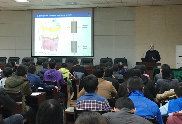 在校期間,Tayfun教授、金哲輝博士為我校師生作了學(xué)術(shù)報(bào)告。他們分別以“提高致密砂巖儲(chǔ)層原油采收率的研究”、“分子角度的頁(yè)巖介質(zhì)中流體相態(tài)及流動(dòng)的熱動(dòng)力學(xué)建模研究”、“What Should I Do Before I Graduate to Build a Strong Petroleum Engineering Career”為題,利用生動(dòng)的圖表與豐富的數(shù)據(jù)展示了各自最新的研究成果,尤其就非常規(guī)地質(zhì)儲(chǔ)層的特征研究、儲(chǔ)層巖石力學(xué)性能分析、儲(chǔ)層流體微觀滲流機(jī)理、儲(chǔ)層改造技術(shù)與室內(nèi)實(shí)驗(yàn)研究等方面內(nèi)容進(jìn)行了詳細(xì)介紹,并在講座最后與我校師生進(jìn)行了交流。