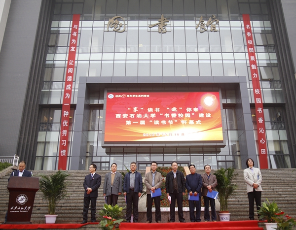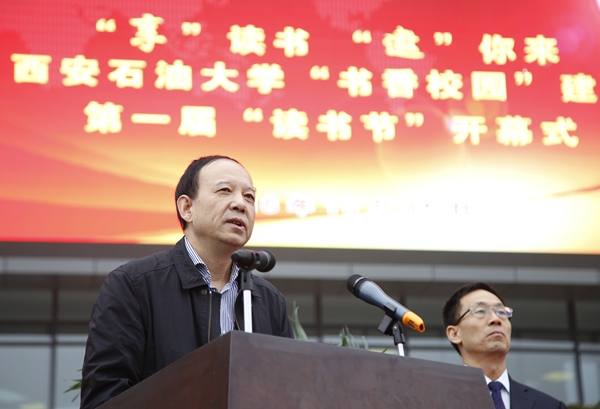 10月15日上午,我?!皶阈@”建設第一屆讀書節(jié)開幕式在新校區(qū)圖書館南廣場隆重舉行。校黨政領導賽云秀、雷西合、陳軍斌,國家一級作家、省文聯(lián)副主席、省作協(xié)副主席高建群,我校人文學院教授王心劍,省圖書館、省新聞出版廣電局、嘉匯漢唐圖書有限責任公司相關領導、嘉賓出席開幕式。我校相關部門、各院(部、系)負責人,全體輔導員及學生代表參加了開幕式。副校長陳軍斌主持開幕式。