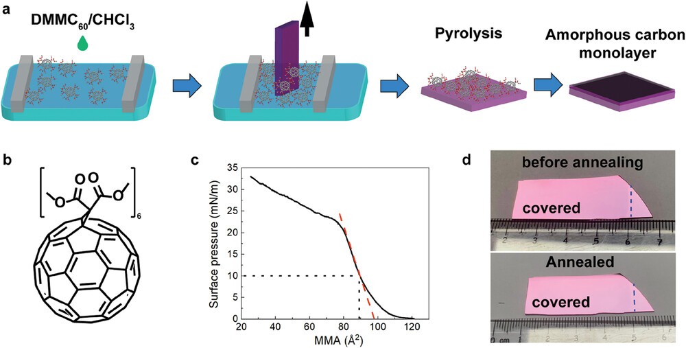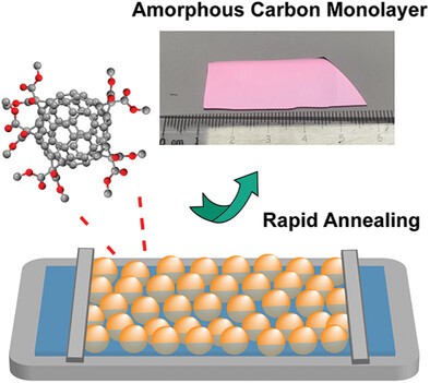 通過常壓下可控?zé)峤飧焕障┛梢垣@得介于富勒烯型碳和石墨烯型碳之間的新型碳材料(Nature,2022, 606, 507)。經(jīng)過斷裂交聯(lián)過程,富勒烯籠之間形成了納米孔結(jié)構(gòu)。但受限于制備方式,所剝離的單層膜一般為微米尺寸,較難進(jìn)行膜性質(zhì)研究。